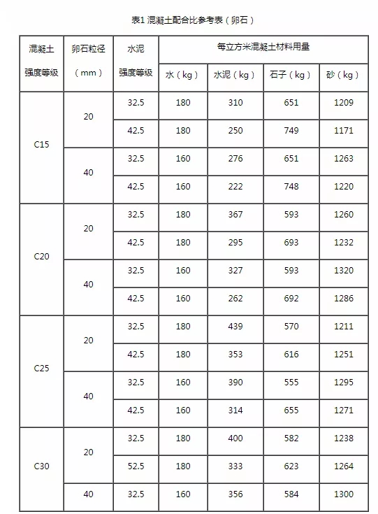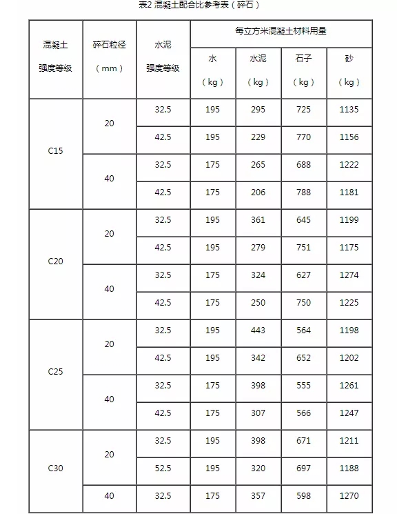 農村建房,多是采用現(xiàn)場自拌混凝土,要嚴格保證拌合料所用的砂、石、水泥及用水量達到配合比的要求,尤其是單方混凝土的水泥用量不能太少。農房建設常用的中低強度混凝土的配合比選用可參考表1、表2。表中給出的配合比相對應的混凝土塌落度為35~50mm。