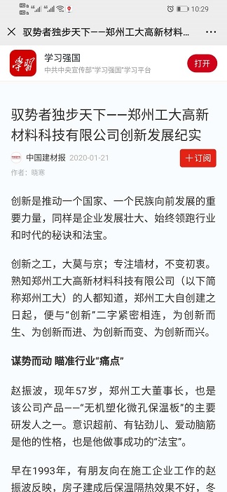 2020年1月21日,《中國建材報》在頭版頭條位置,刊發(fā)了本公司長篇紀實通訊《馭勢者獨步天下——鄭州工大高新材料科技有限公司創(chuàng)新發(fā)展紀實》,文中對公司發(fā)展歷程進行記述的同時,對公司產(chǎn)品“無機塑化微孔保溫板”給予了高度評價,文章說:“無機塑化微孔保溫板”不僅占領了保溫墻材行業(yè)的“高點”,也徹底解決了國內(nèi)節(jié)能建筑防火與保溫不能兼容的行業(yè)窘迫局面。隨后,學習強國、經(jīng)濟日報公眾號全文轉發(fā)。文章全文如下: