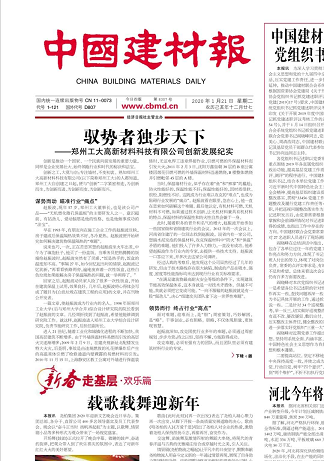 2020年1月21日,《中國建材報》在頭版頭條位置,刊發(fā)了本公司長篇紀實通訊《馭勢者獨步天下——鄭州工大高新材料科技有限公司創(chuàng)新發(fā)展紀實》,文中對公司發(fā)展歷程進行記述的同時,對公司產(chǎn)品“無機塑化微孔保溫板”給予了高度評價,文章說:“無機塑化微孔保溫板”不僅占領了保溫墻材行業(yè)的“高點”,也徹底解決了國內(nèi)節(jié)能建筑防火與保溫不能兼容的行業(yè)窘迫局面。隨后,學習強國、經(jīng)濟日報公眾號全文轉發(fā)。文章全文如下: